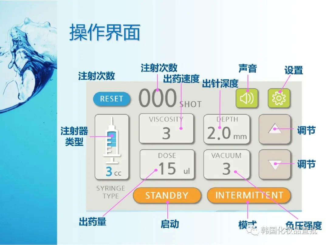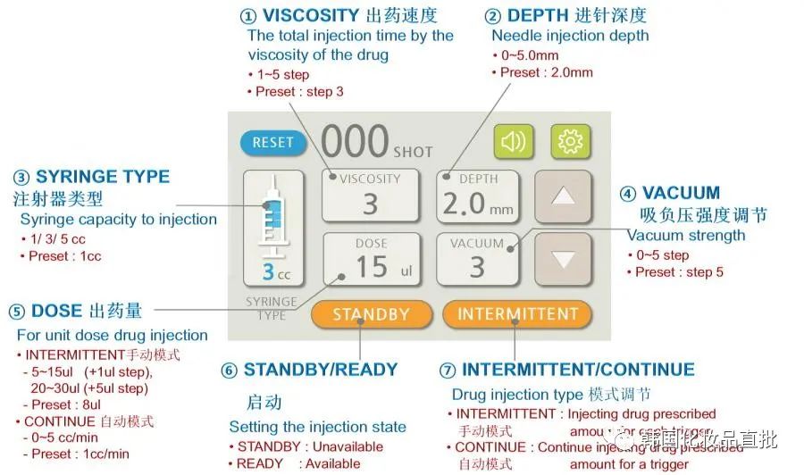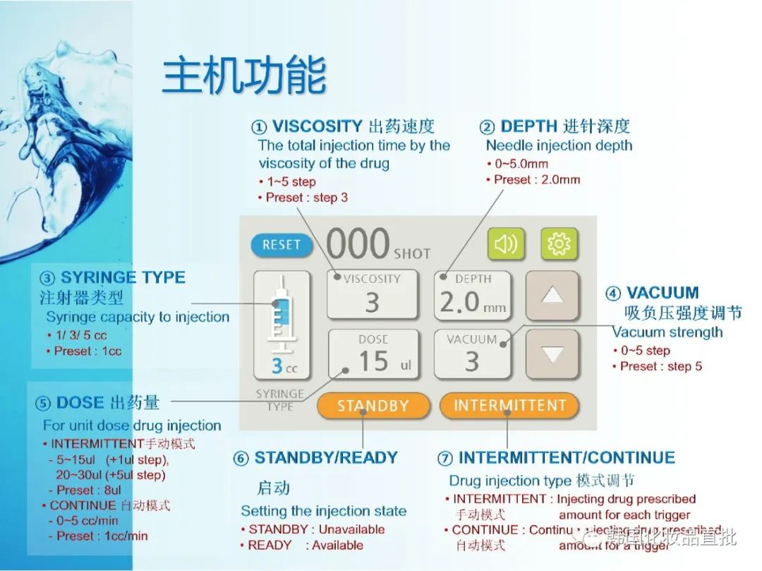 Injection Depth : 0~5mm(0.2mm interval) Injection Mode : intermittent, continue Dose