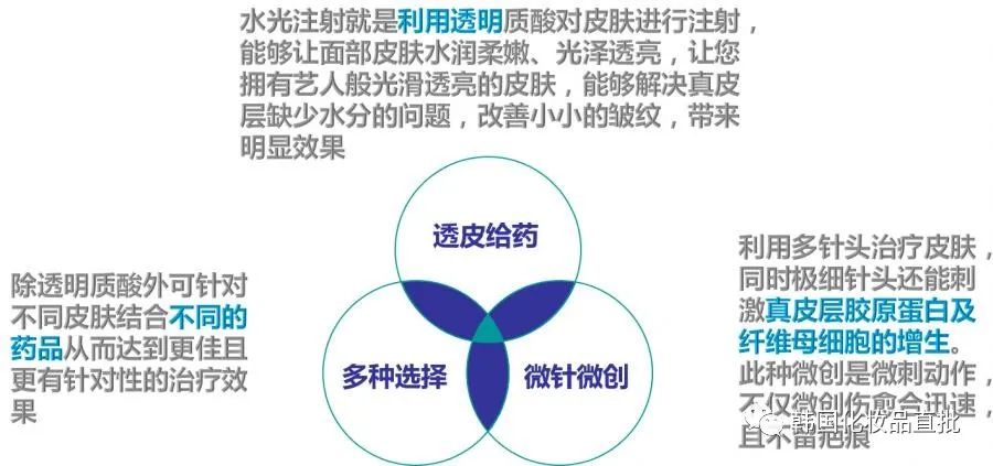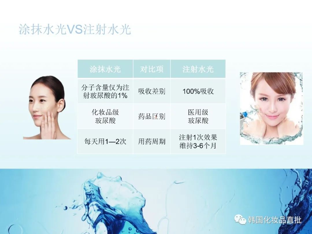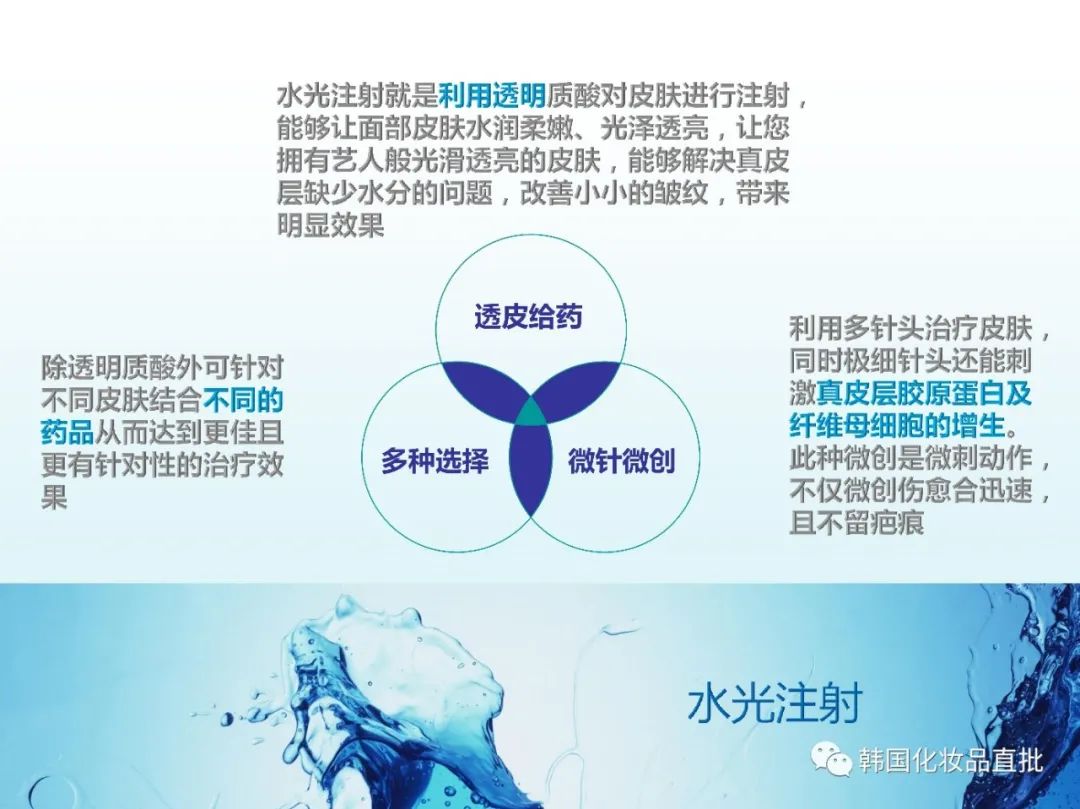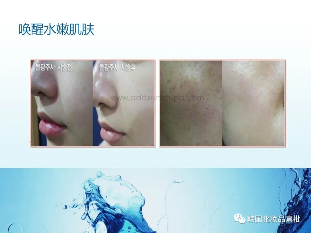 Water mesotherapy is to inject hyaluronic acid into skin. Hyaluronic acid contains moisture, 200-300 times as rich as one's body. So that it makes the skin smooth, soft, bright and hydrated after the injection. In order to keep the skin hydrated, ladies always choose varied skin care products. Actually, skin care products only hydrate moisture on the cutin. So that over smearing those products cannot deeply provide moisture for the skin. As we know, acne, wrinkle and inelasticity would appear if skin lacks moisture. Water mesotherapy will solves all the problems by reason of lacking moisture, such as sallow skin, color spot, wrinkle… And it will supply moisture for dermis. Therefore water mesotherapy works well on whitening, moisturizing and renewing inelasticity.