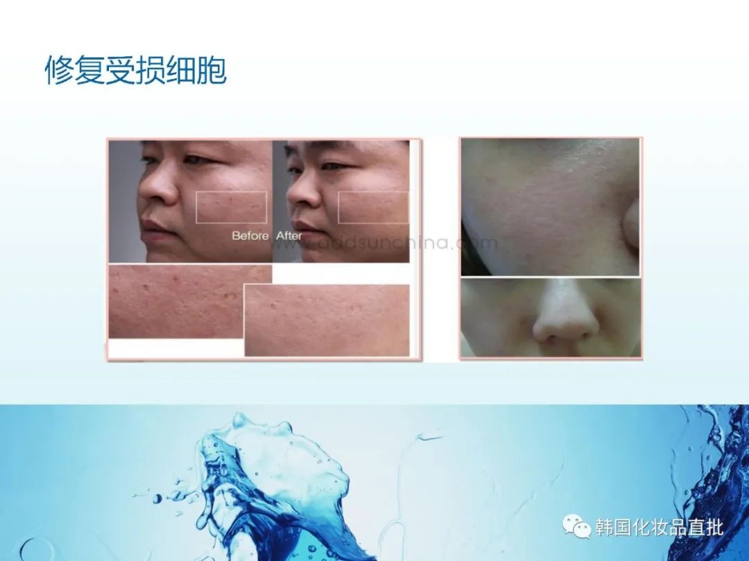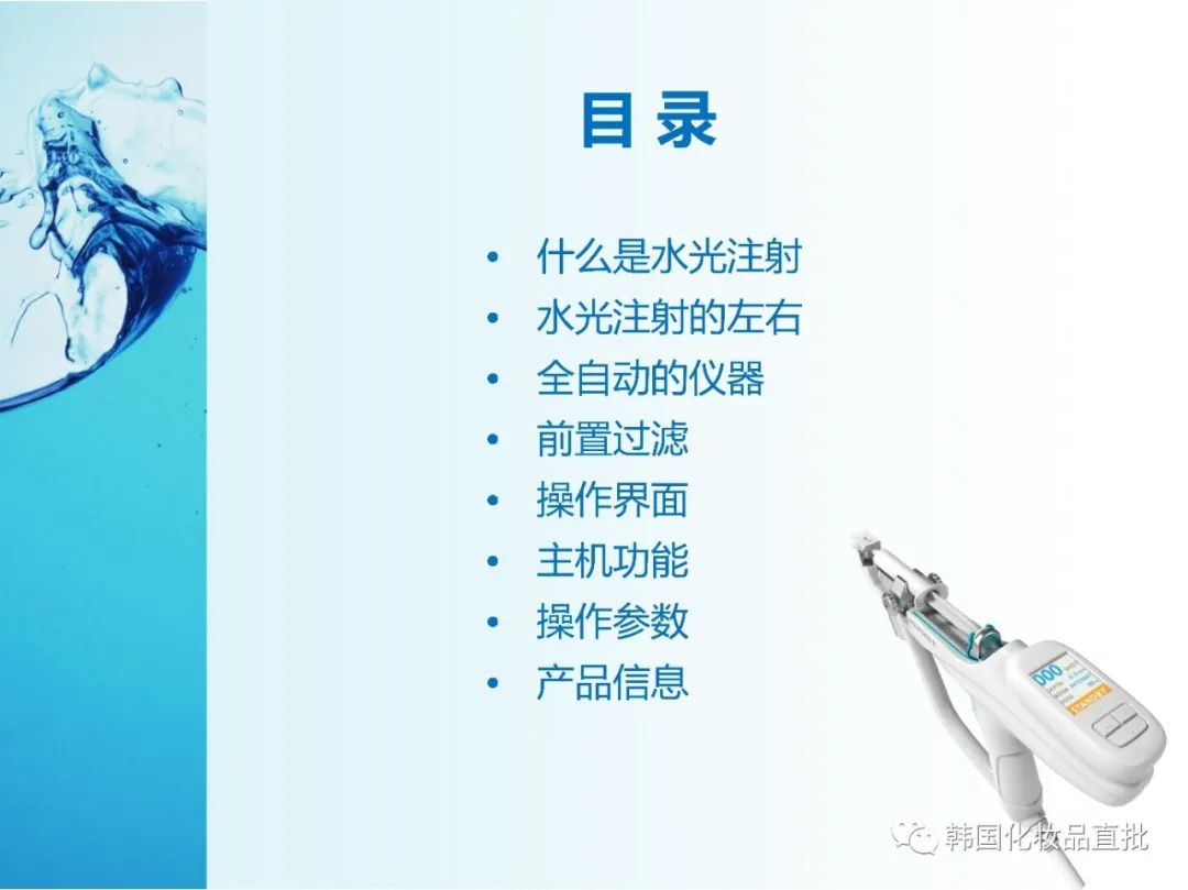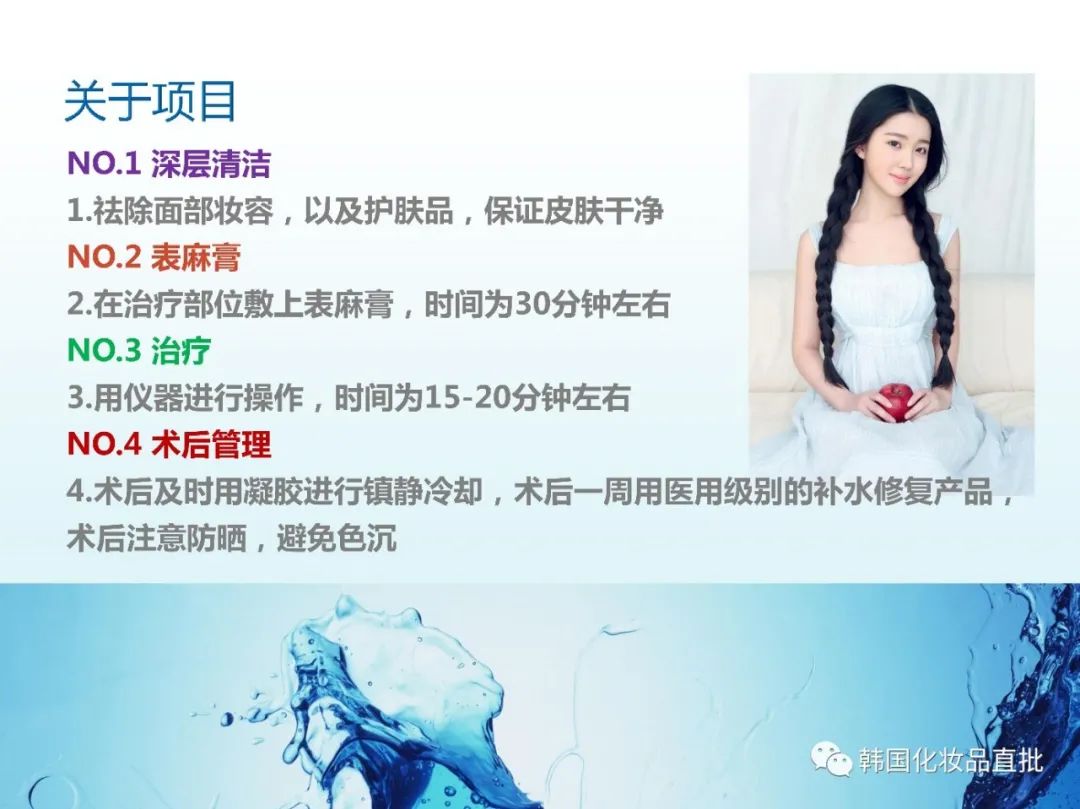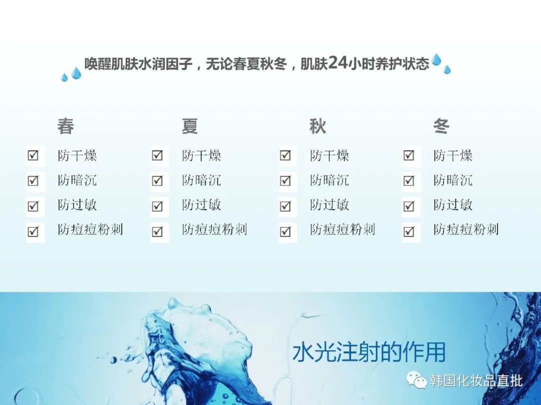 Water mesotherapy is to inject hyaluronic acid into skin. Hyaluronic acid contains moisture, 200-300 times as rich as one's body. So that it makes the skin smooth, soft, bright and hydrated after the injection. In order to keep the skin hydrated, ladies always choose varied skin care products. Actually, skin care products only hydrate moisture on the cutin. So that over smearing those products cannot deeply provide moisture for the skin. As we know, acne, wrinkle and inelasticity would appear if skin lacks moisture. Water mesotherapy will solves all the problems by reason of lacking moisture, such as sallow skin, color spot, wrinkle… And it will supply moisture for dermis. Therefore water mesotherapy works well on whitening, moisturizing and renewing inelasticity.