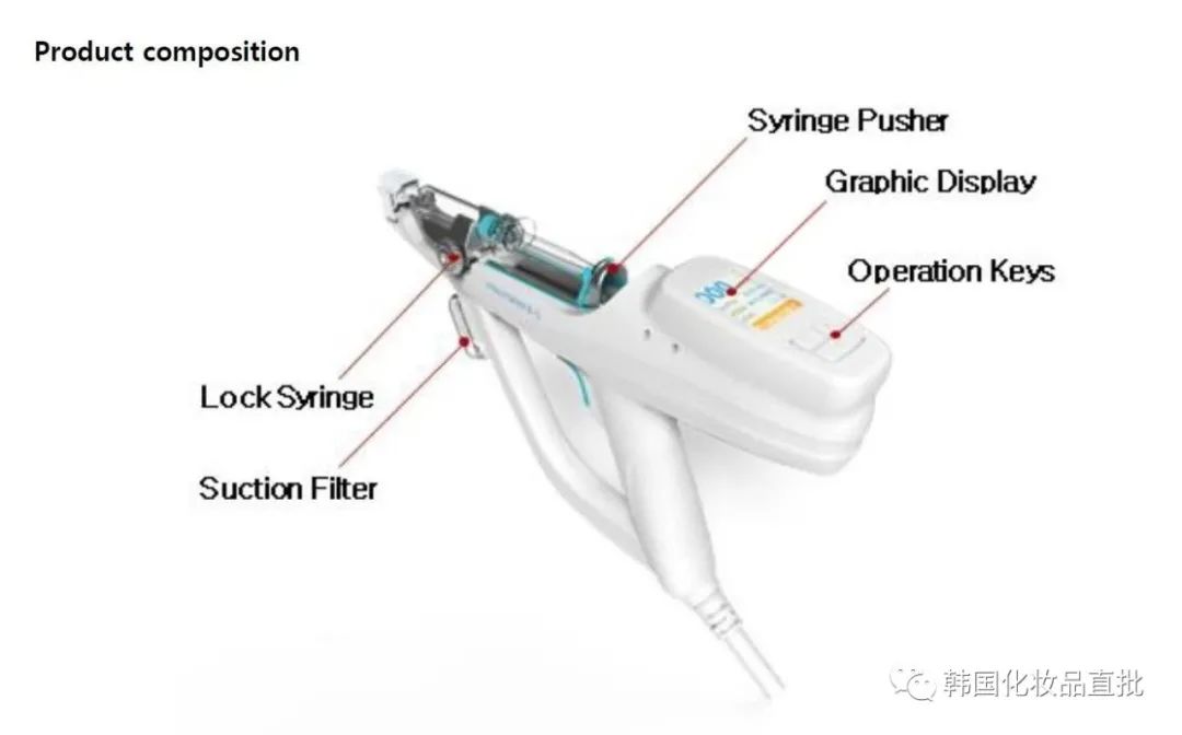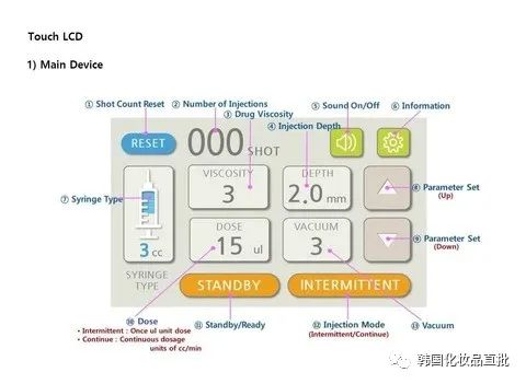 Needle 针头5-Pin Multi Needle (31G) 5针针头Injection Depth 进针0~5mm (0.2mm Interval) 0~5mm可调节Syringe Type1cc / 3cc / 5ccDose 出药Intermittent : 5~30ul (1ul Accuracy)Continue : 0.8~7.5 cc/minSuction Filter 过滤器Dual Filter (Each one body & handpiece) 一次性Display 显示器Main 主机 : Size(5.0”) , Pixel(800*480)