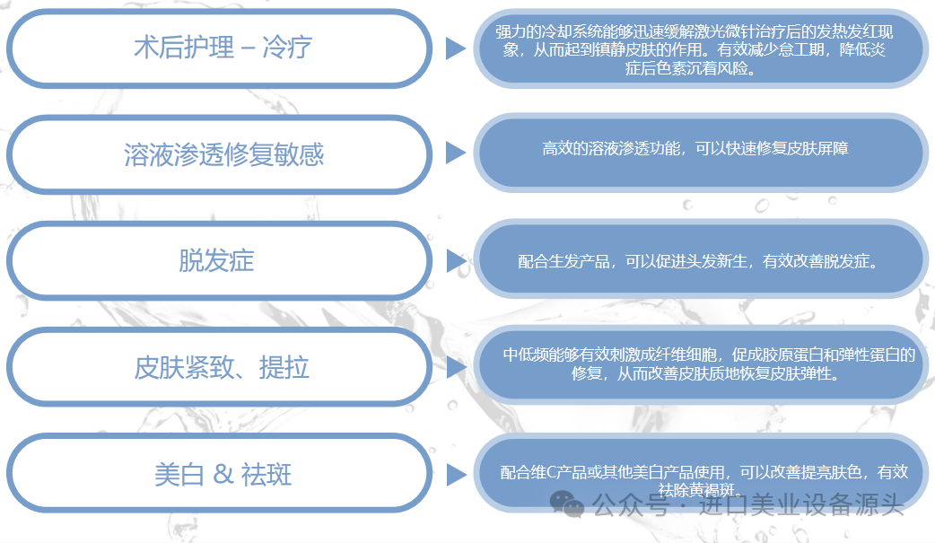 1.半导体制冷片可以使电极探头降温2.冷冻液的来回水循环减少TEC模块的温度,并且能够保持长时间的低温。-20°C强力冷却功能能够迅速给刚做完激光/微针后的皮肤降温,从而起到镇静皮肤的作用,能有效缩短怠工期,降低炎症后色素沉着的风险。