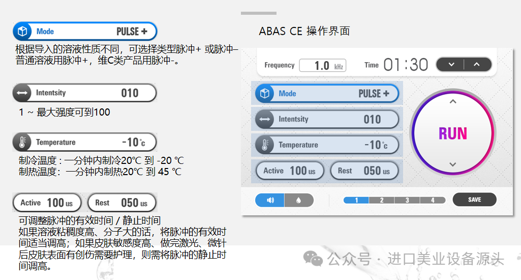 7.根据溶液的粘稠度、分子大小、皮肤敏感度可调节脉冲有效时间/静止时间