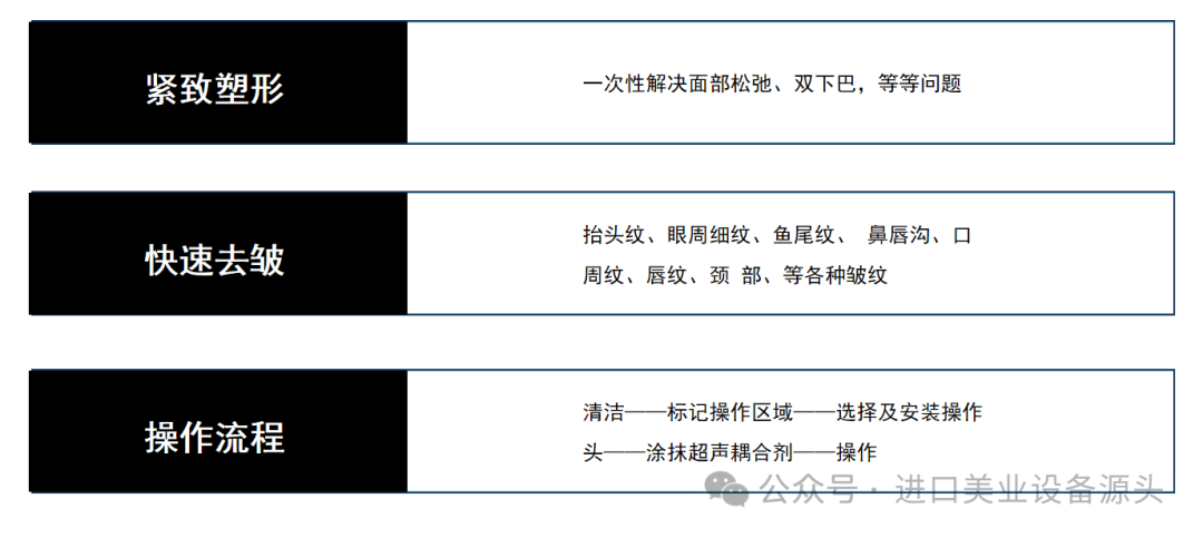 仪器原理:超声治疗仪是一款能快速紧致皮肤,改善皮肤衰老导致的松、垂、皱纹等皮肤问题的抗衰设备。它采用微点聚焦的方式,将超声波能量聚焦在皮下SMAS筋膜层、真皮层、 脂肪组织,并且形成微细热凝固点TCP,起到提拉紧致的作用,达到筋膜悬吊拉皮的效果,再由深至浅改善皮肤皮下结构,令老化的胶原蛋白收缩,并刺激胶原蛋白增生和重组,使皮肤恢复弹性。仪器介绍:1.超声深层抗衰是利用高强度聚焦式超声波,作用于皮下深层,超声的穿透深度和 精准度较高。2.不伤害皮肤表面的同时作用于肌肤真皮层、筋膜层,刺激胶原蛋白的增生与重组,可以起到收紧轮廓,除皱紧肤的作用。3.非侵入式、安全、快速、舒适、有效。4.全层抗衰,smas筋膜层、皮下脂肪、真皮层全覆盖,全面应对肌肤衰老问题。