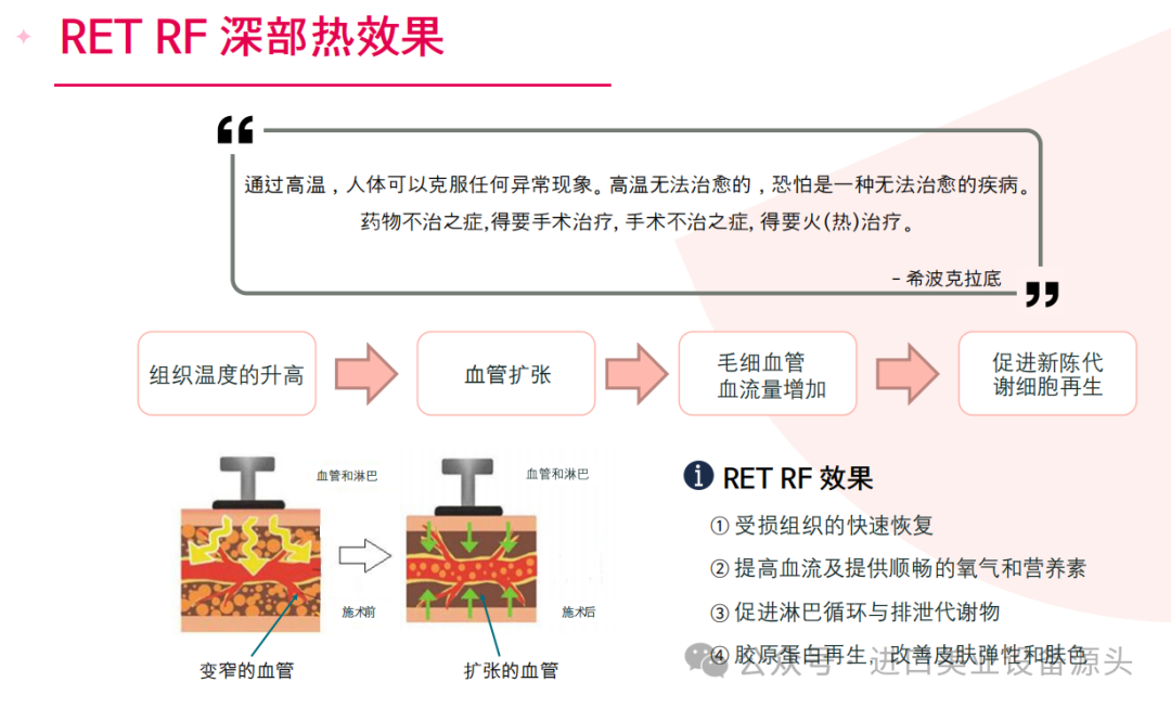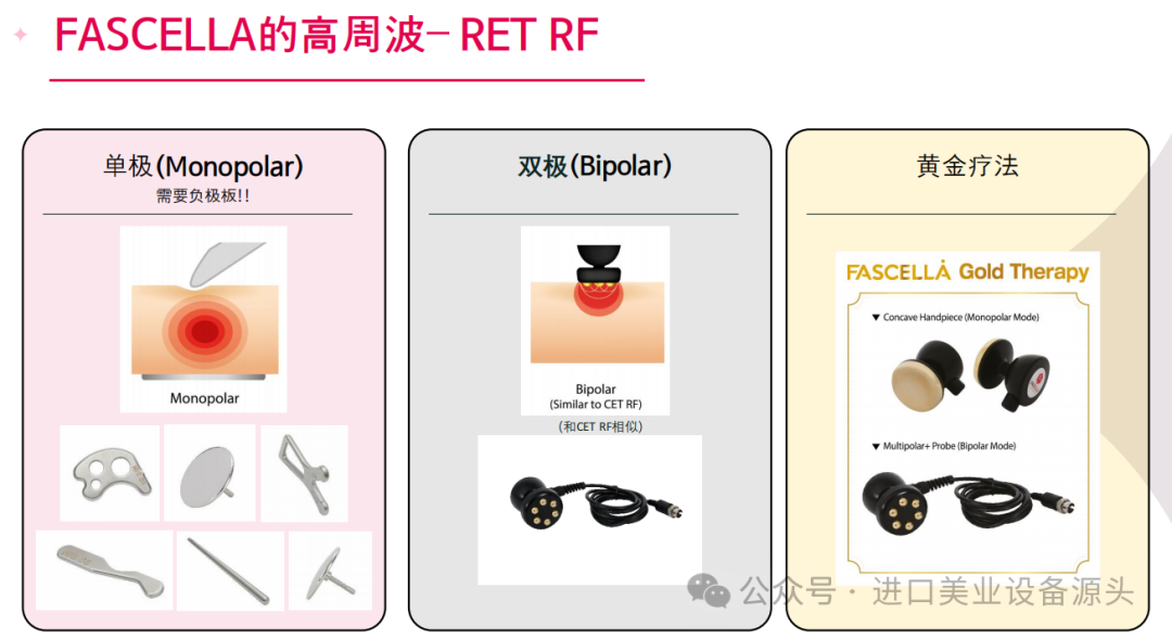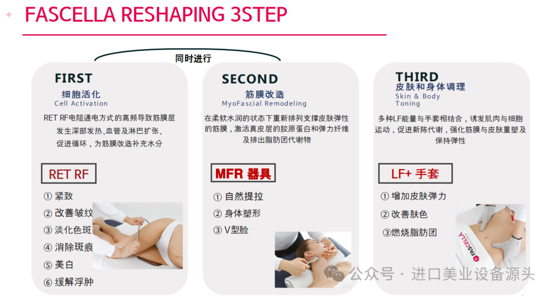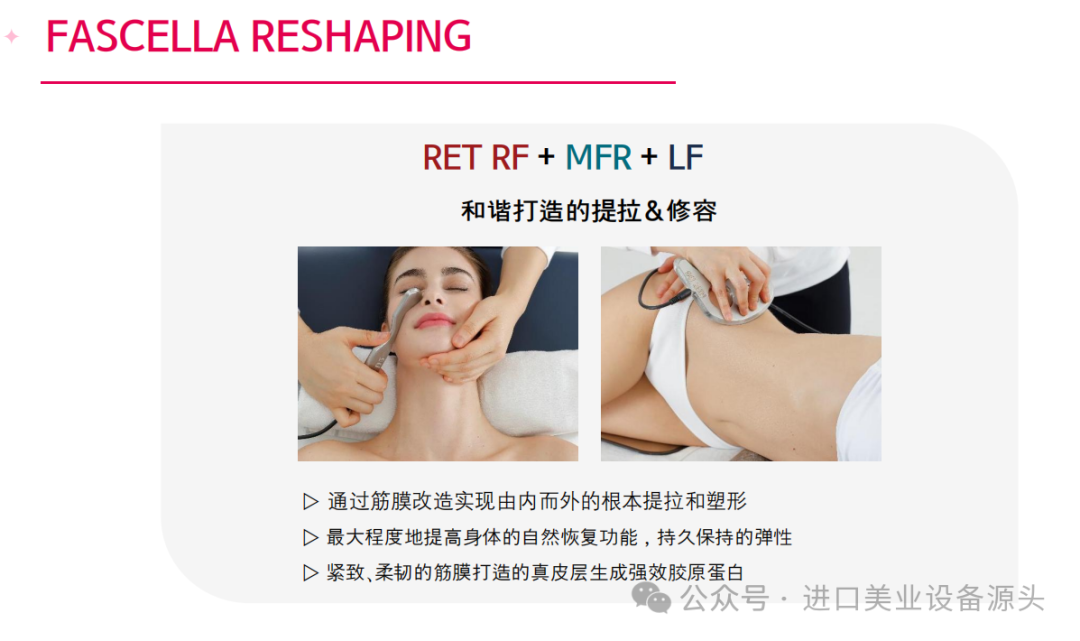 1. 护理根源、启动身体再生系统的手术- 通过细胞活性化及筋膜改造,从根源解决肌肤身体线条问题,找回身体平衡,手术效果更持久的新概念筋膜提拉系统2. 100%非侵入式手术,无麻醉、无副作用、无疼痛的舒适手术3. 经批准的安全设备4. 立即提拉&塑形效果5. 采用智能复合疗法,施术时间短-可同时使用RET RFMFR(筋膜改造)器具、LF和手套电极6.皮肤科及整形外科手术前后管理必备设备7. 面部身体均可使用